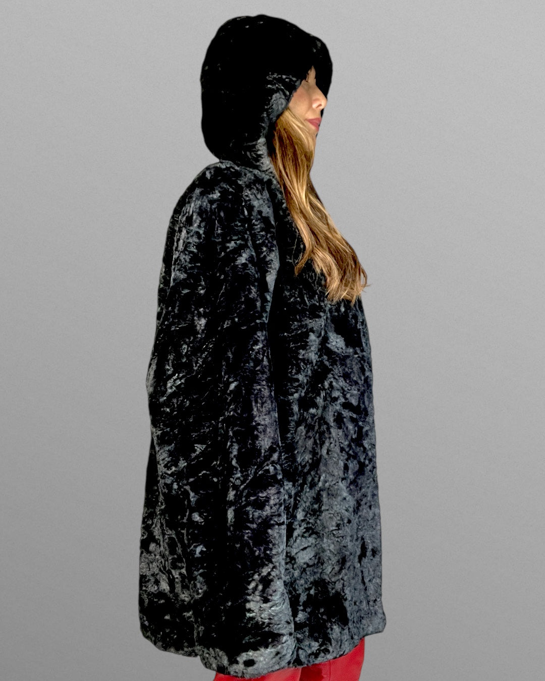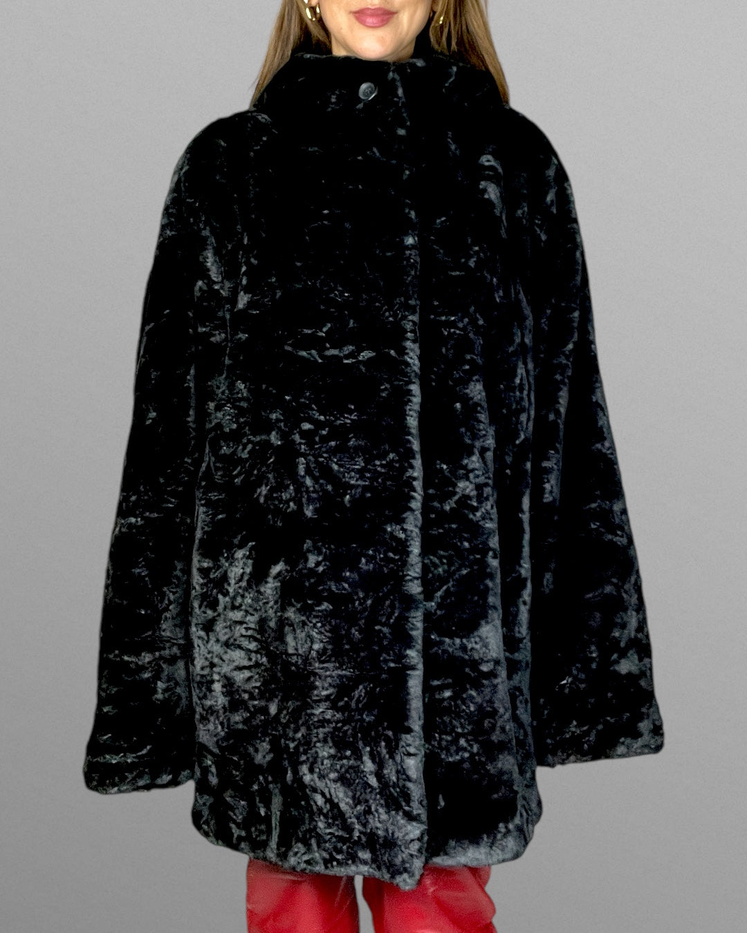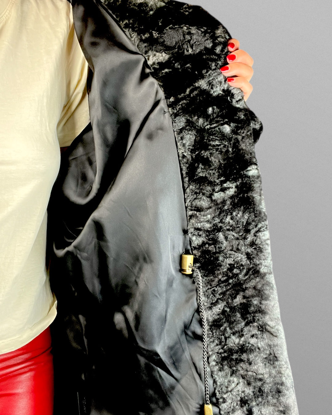 Varm och skön lång fuskpäls. Märkt med storlek XL, men är väldigt fin att bära oversized, kan med fördel bäras av en person i storlek M till XL. Finns dragsko på insidan om man vill minska midjan. Stängs med hylsor.
