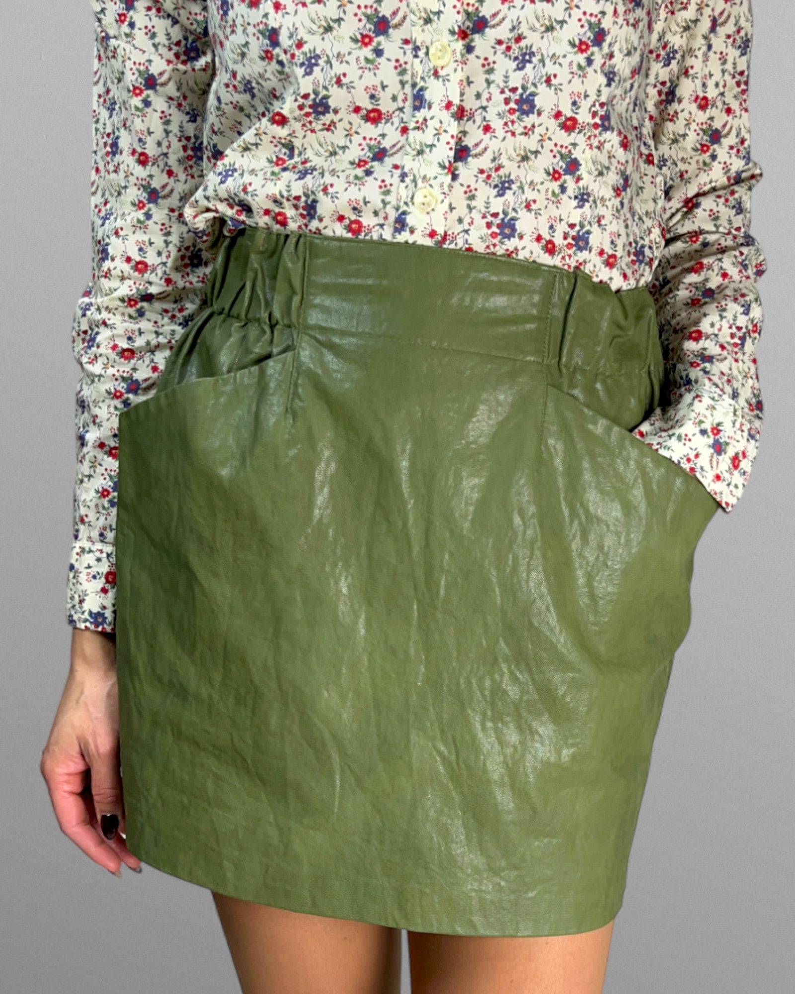 Grön minikjol i Paperbag-modell, med fickor fram och resår i midjan.