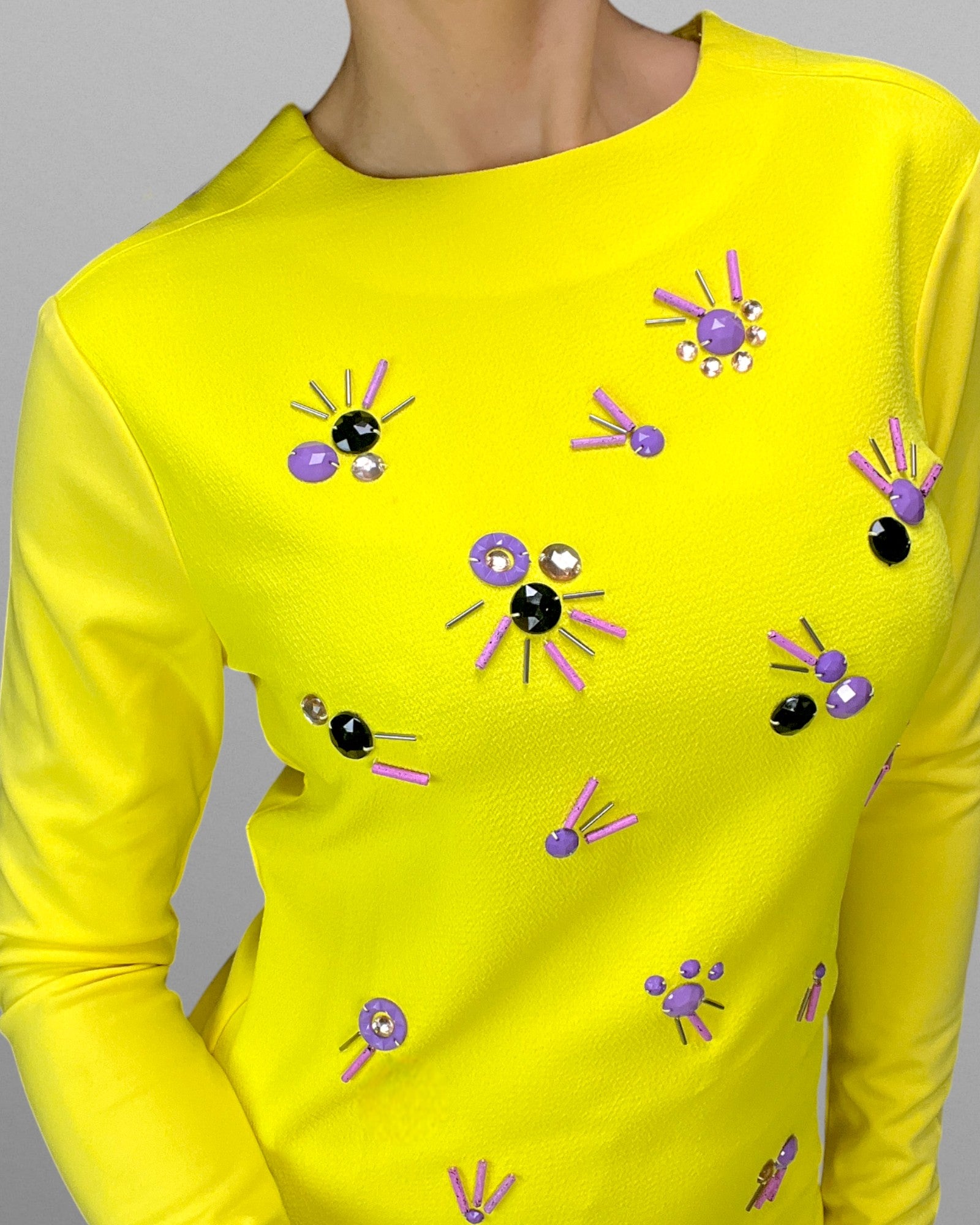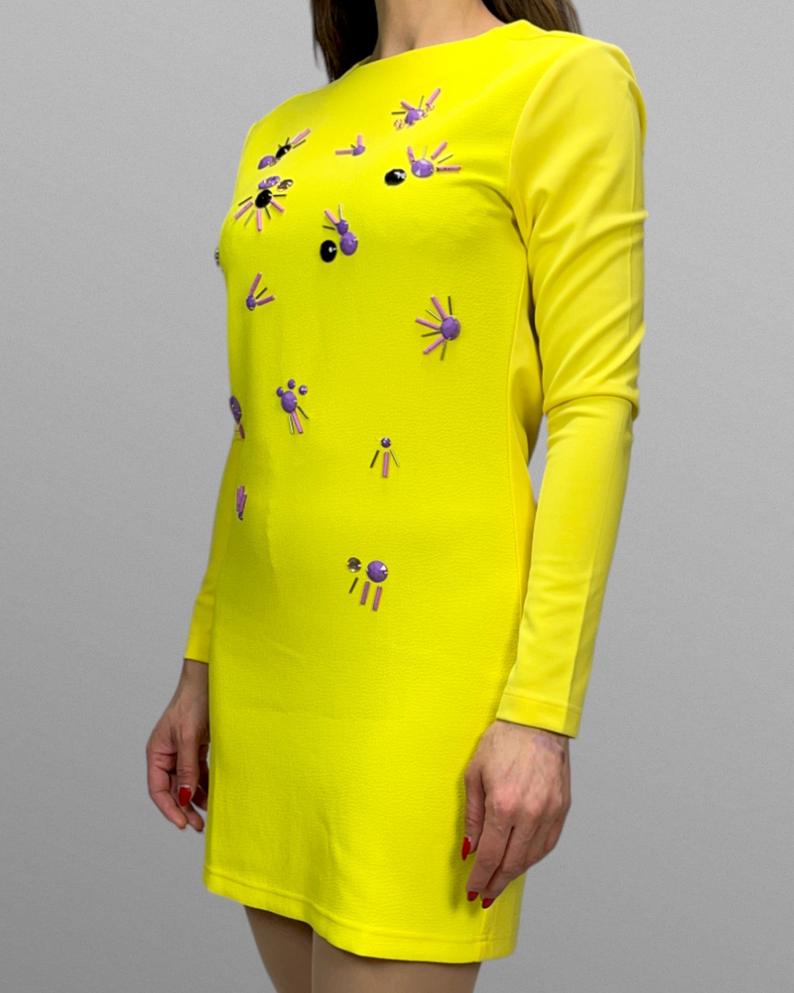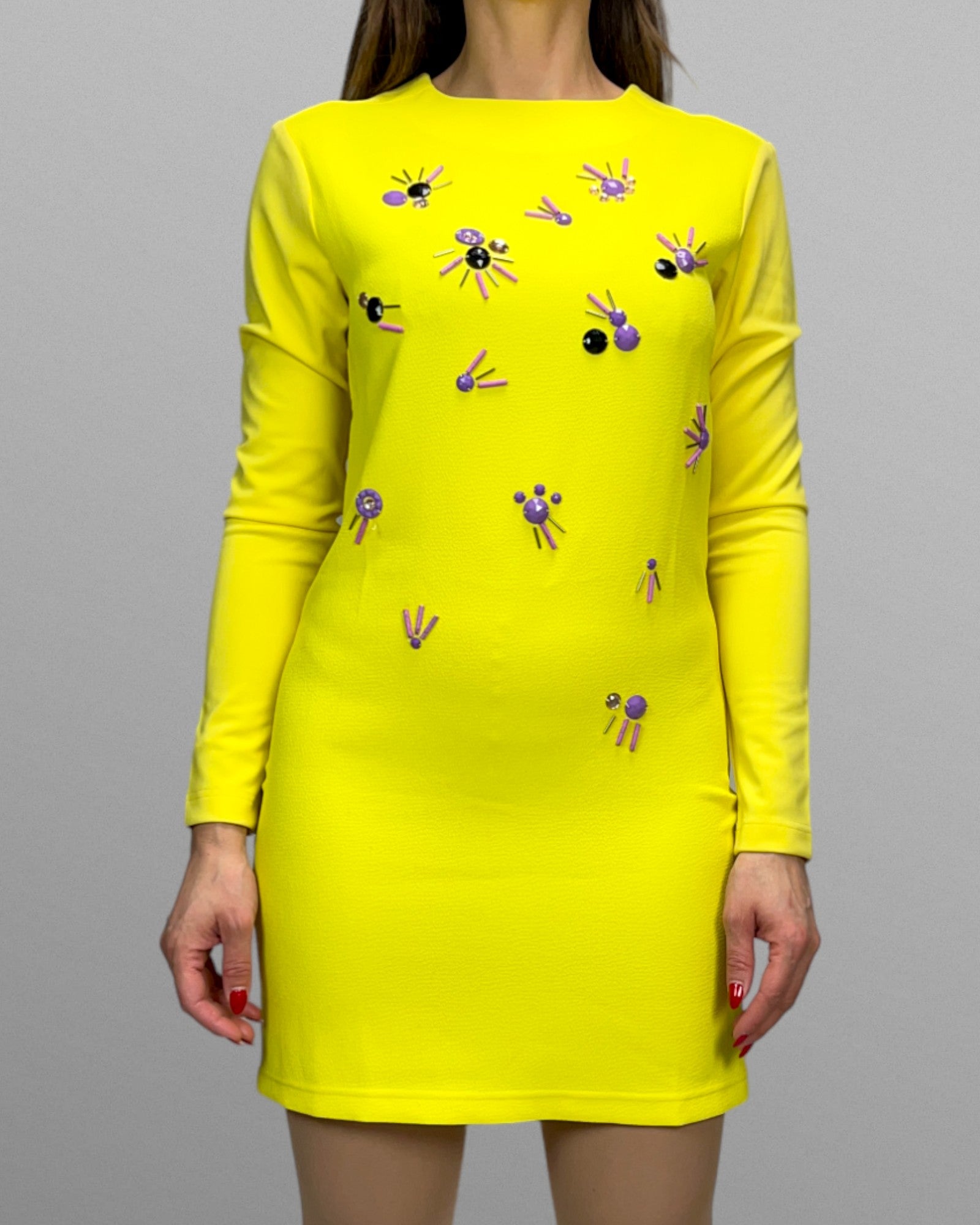 Långärmad miniklänning med pärlor. Bekväm i stretchigt tyg. Försluts med dragkedja baktill. Märkt storlek 8, motsvarar en medium.