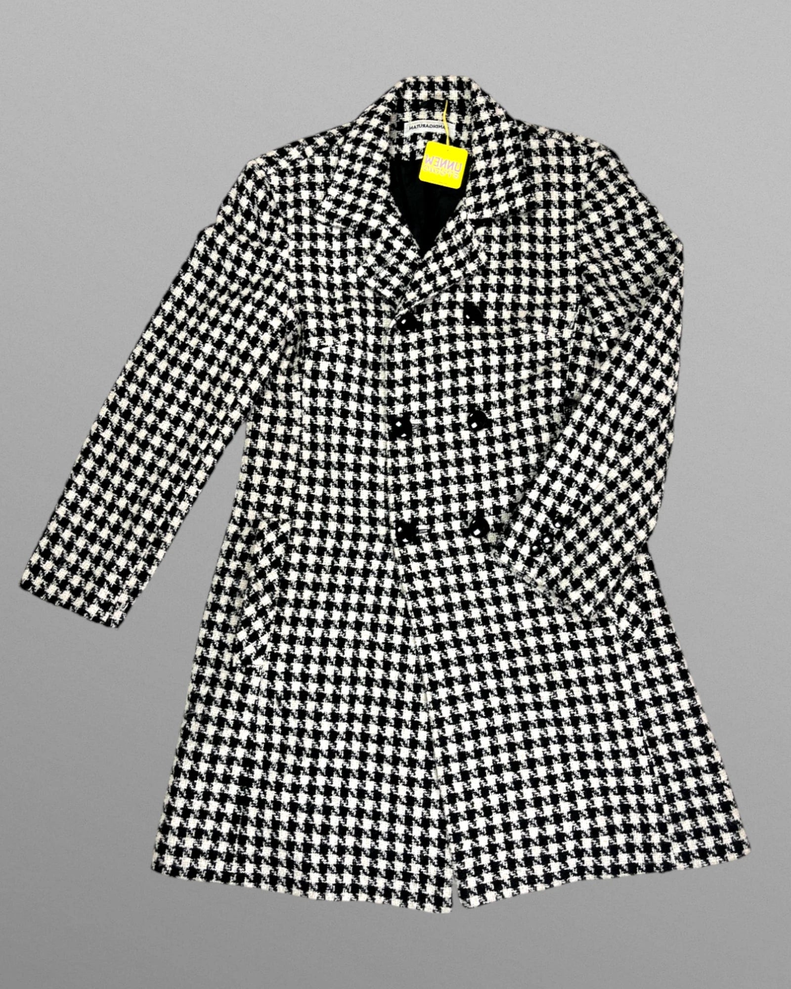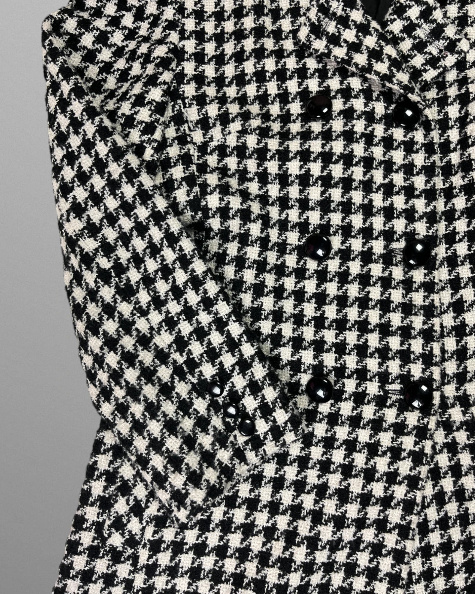 Vintage 90-tals hundtandsmönstrad kappa. Dubbelknäppt, tunt fodrad och knälång.