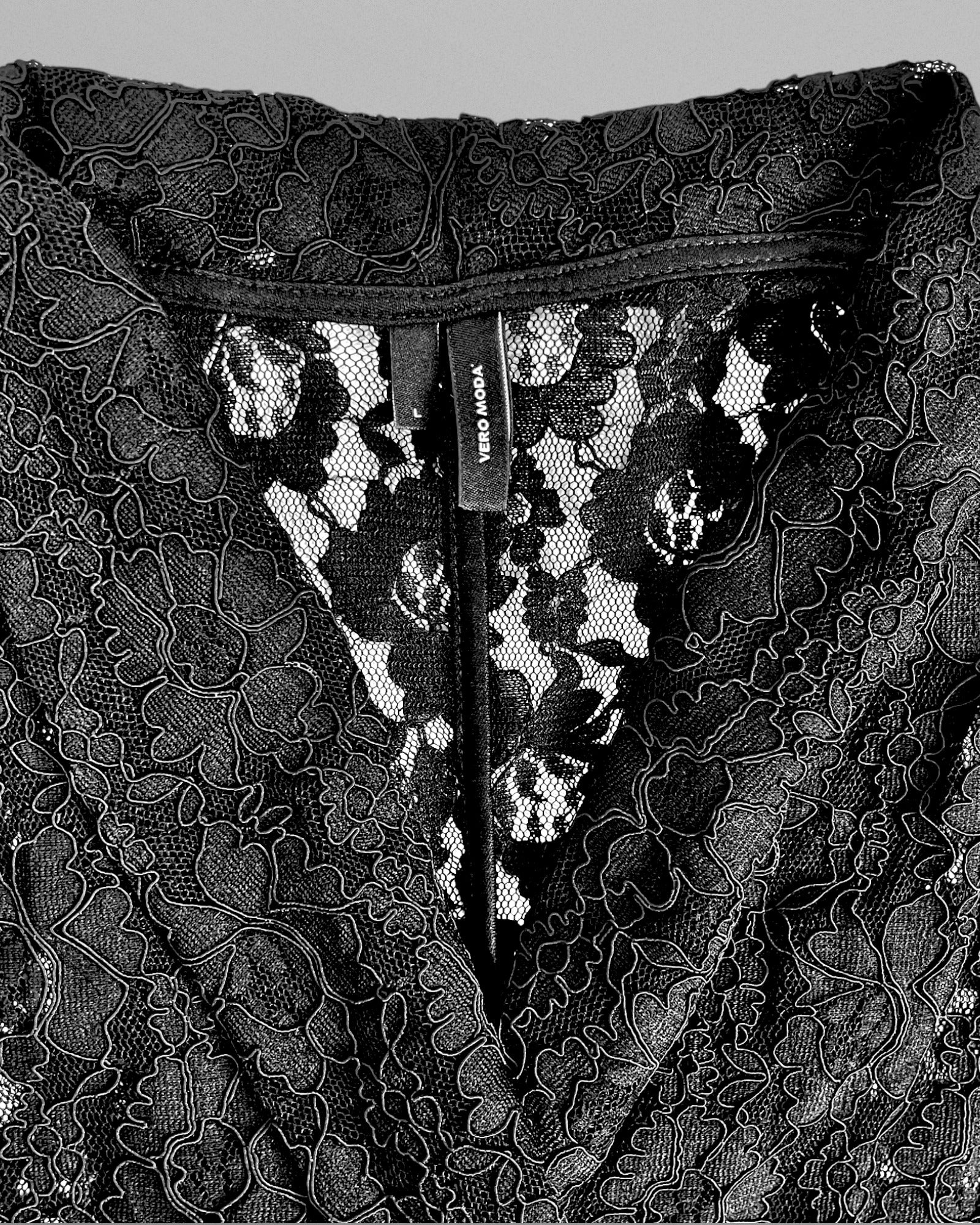 Dubbelknäppt svart spetskavaj. Tyget har stretch i sig och kavajen kan bäras av en M-L som figurnära modell eller lite oversized på en storlek small som i bilden.