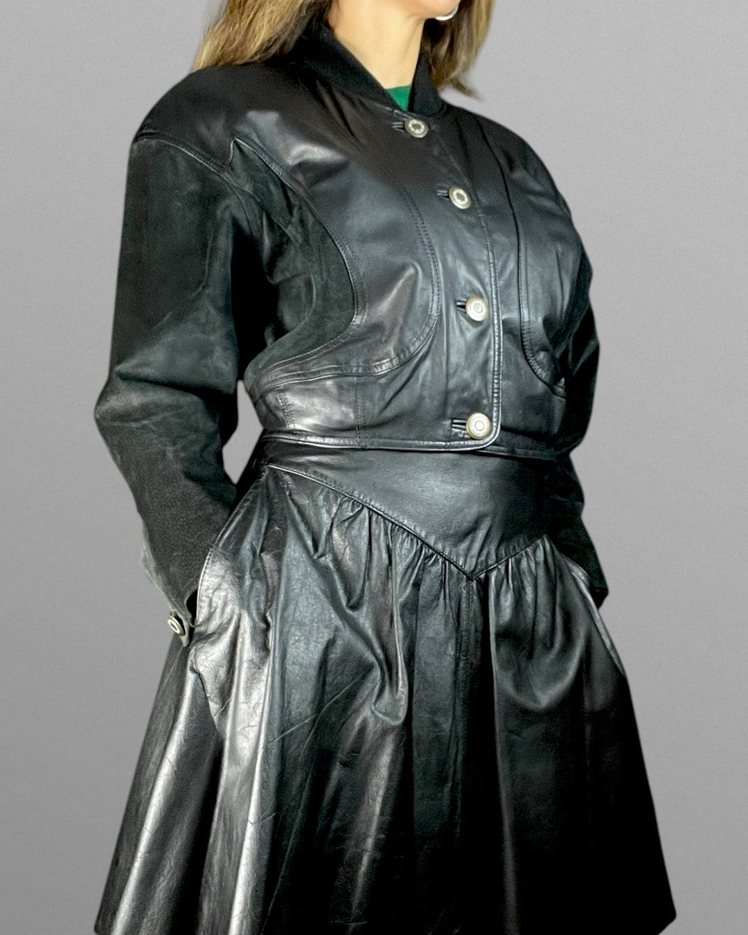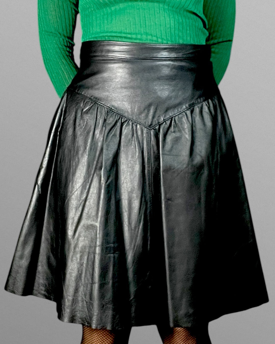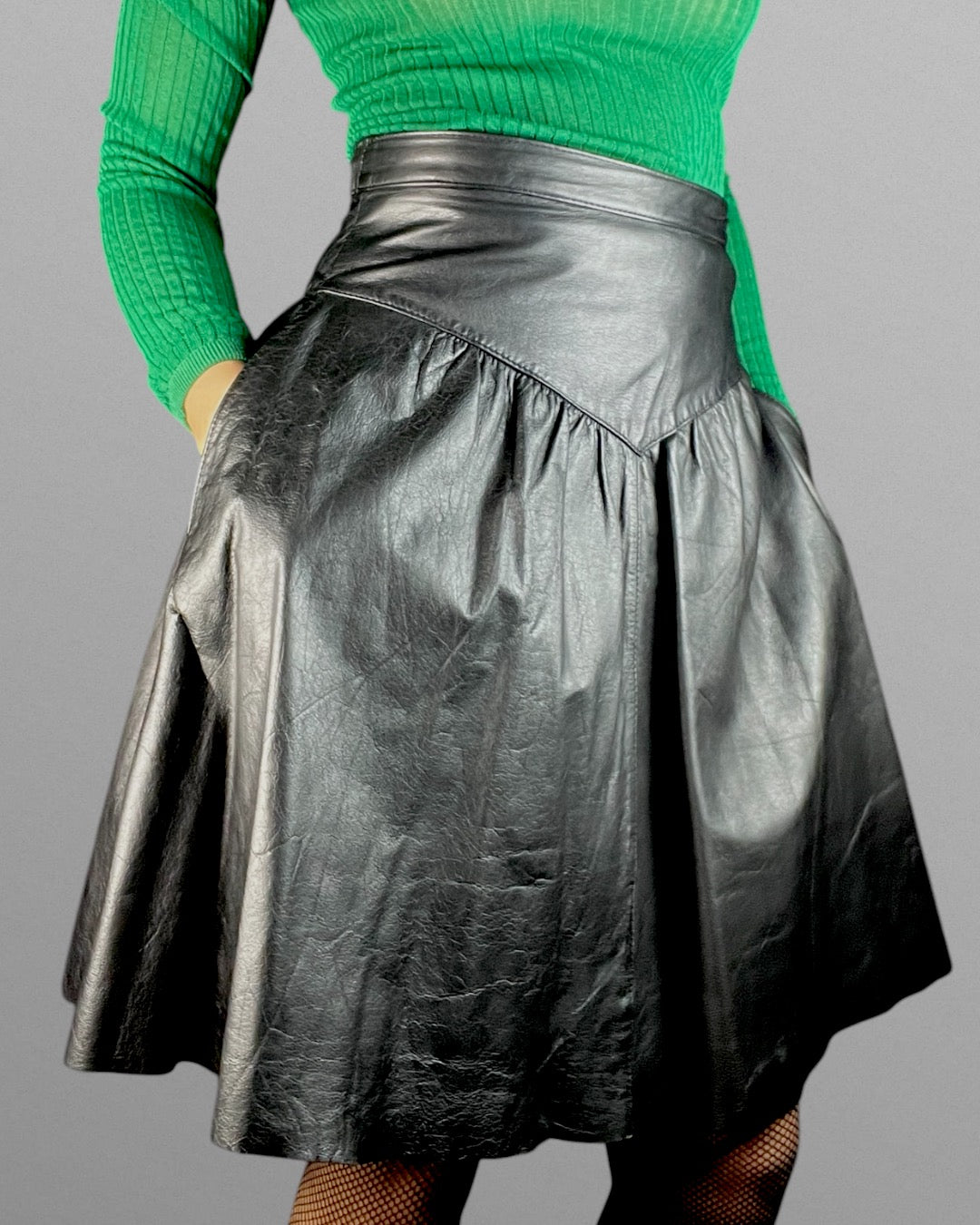 Svart skinnkjol i en klockad modell som andas 90-tal. Snygga detaljer och praktiska fickor och en dragkedja baktill. Ett riktigt vintagefynd!