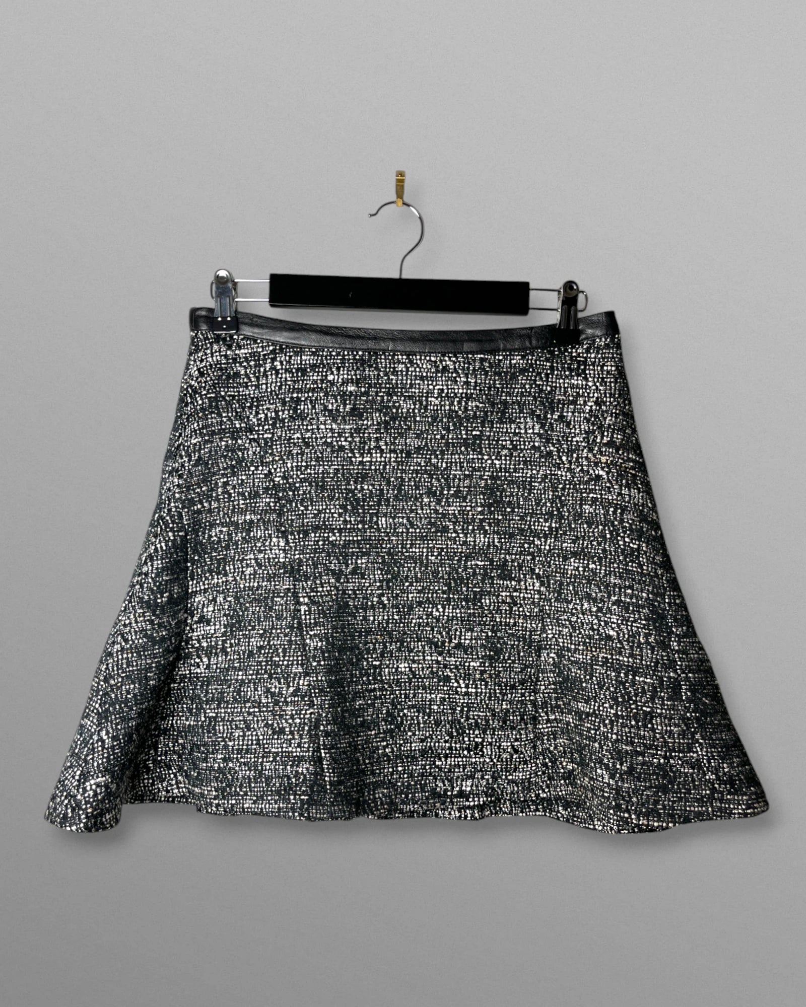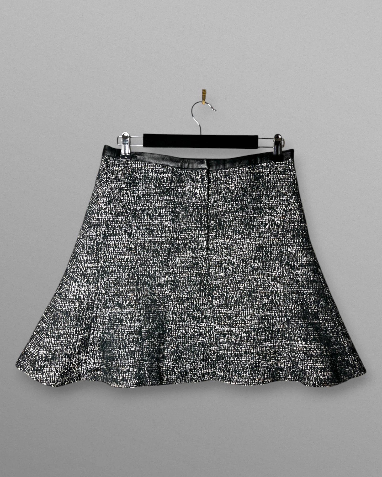 Kort klockad kjol med dekorativ kant i läderimitation i midjan. Tyget har en fin vävd struktur.