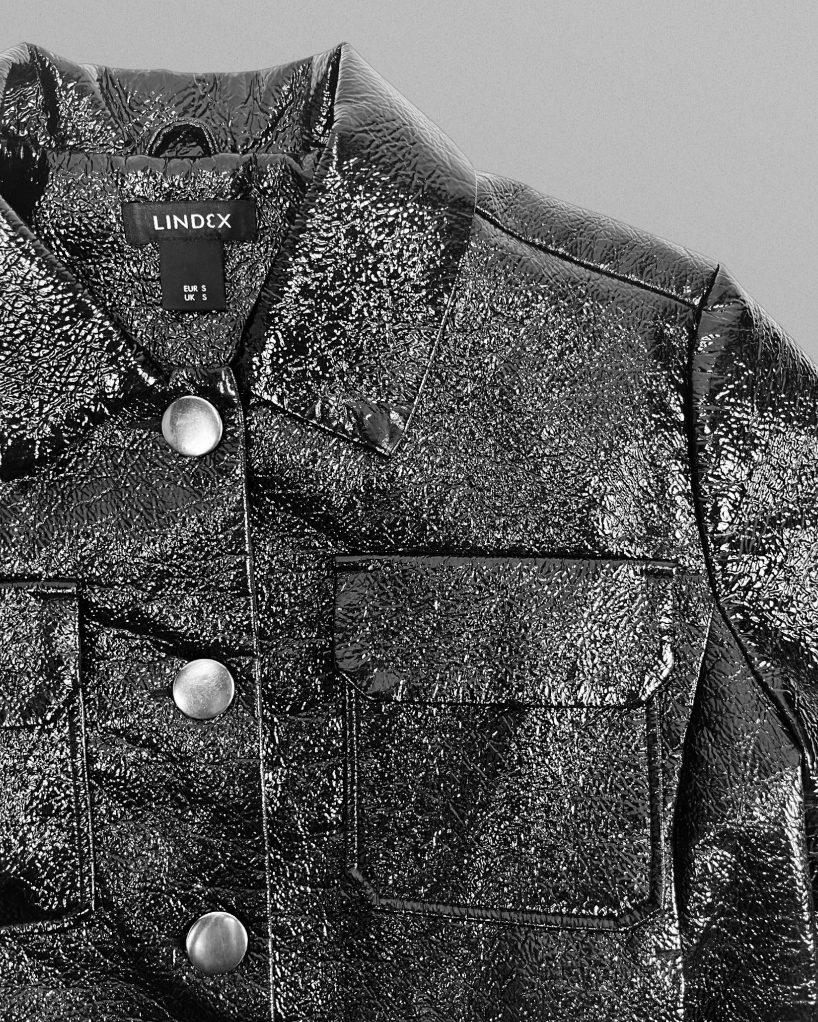 Lackad svart jacka som även kan användas som en kavaj den här tiden på året.