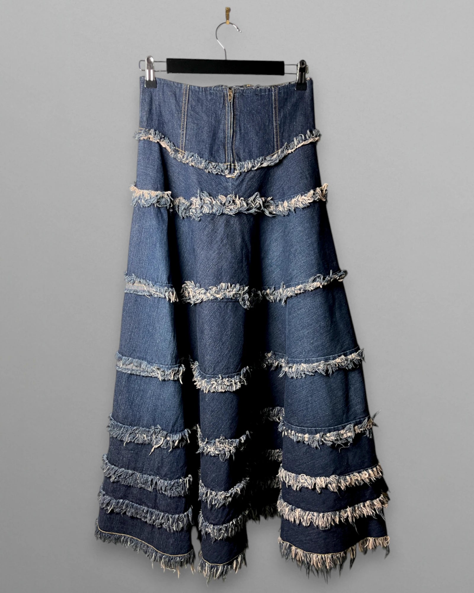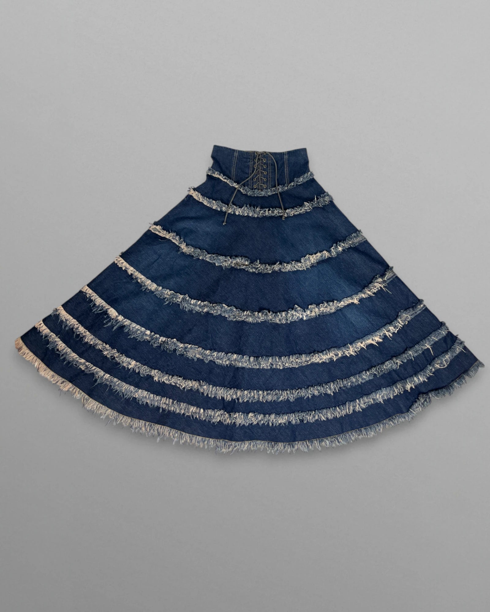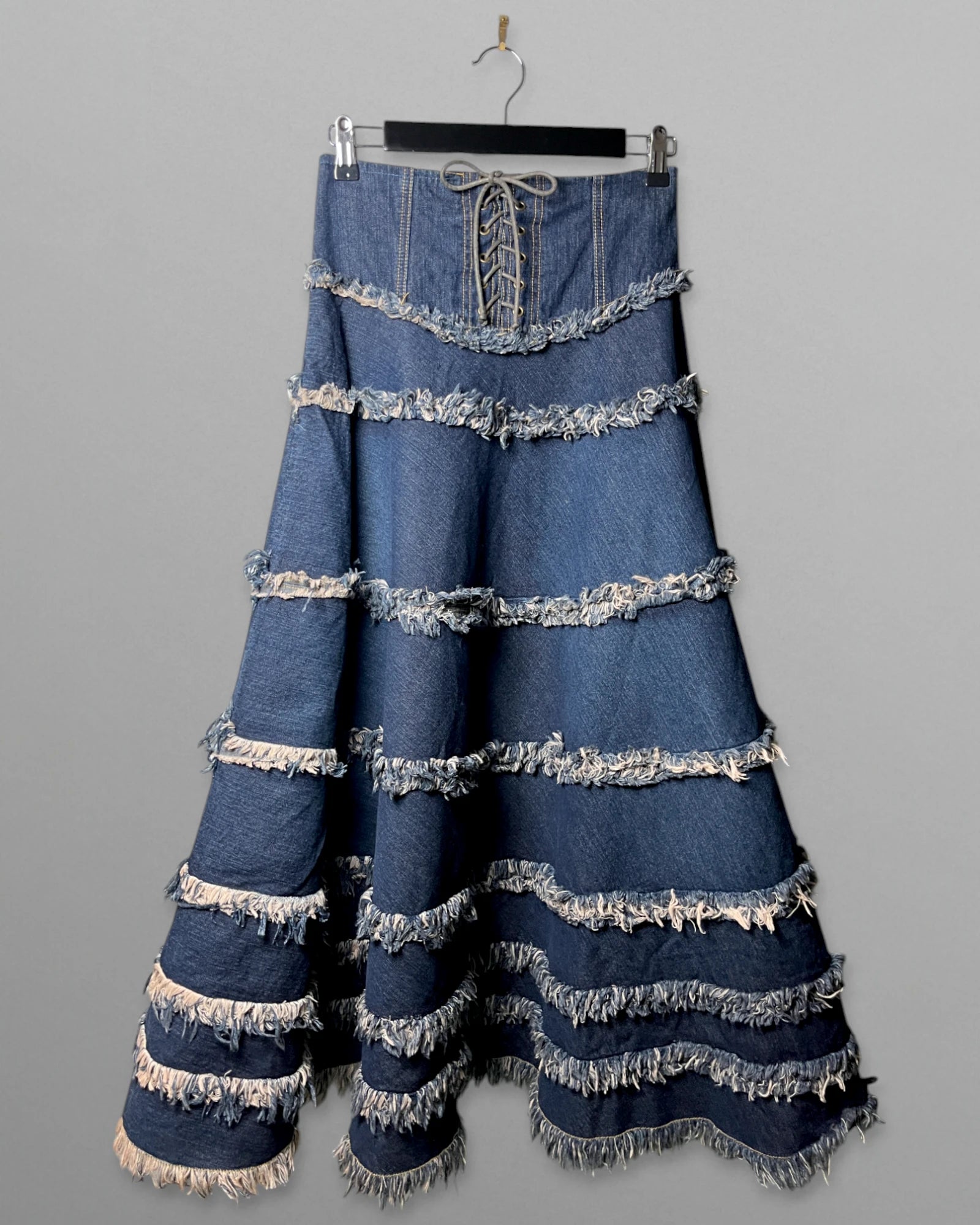 En denimdröm från 90-talet! Denna långa kjol är full av fina detaljer som fransar och snörning i midjan och stängs smidigt med en dragkedja baktill. Med generöst tyg får kjolen en härlig tyngd och ett vackert fall som ger en härlig vintagekänsla.