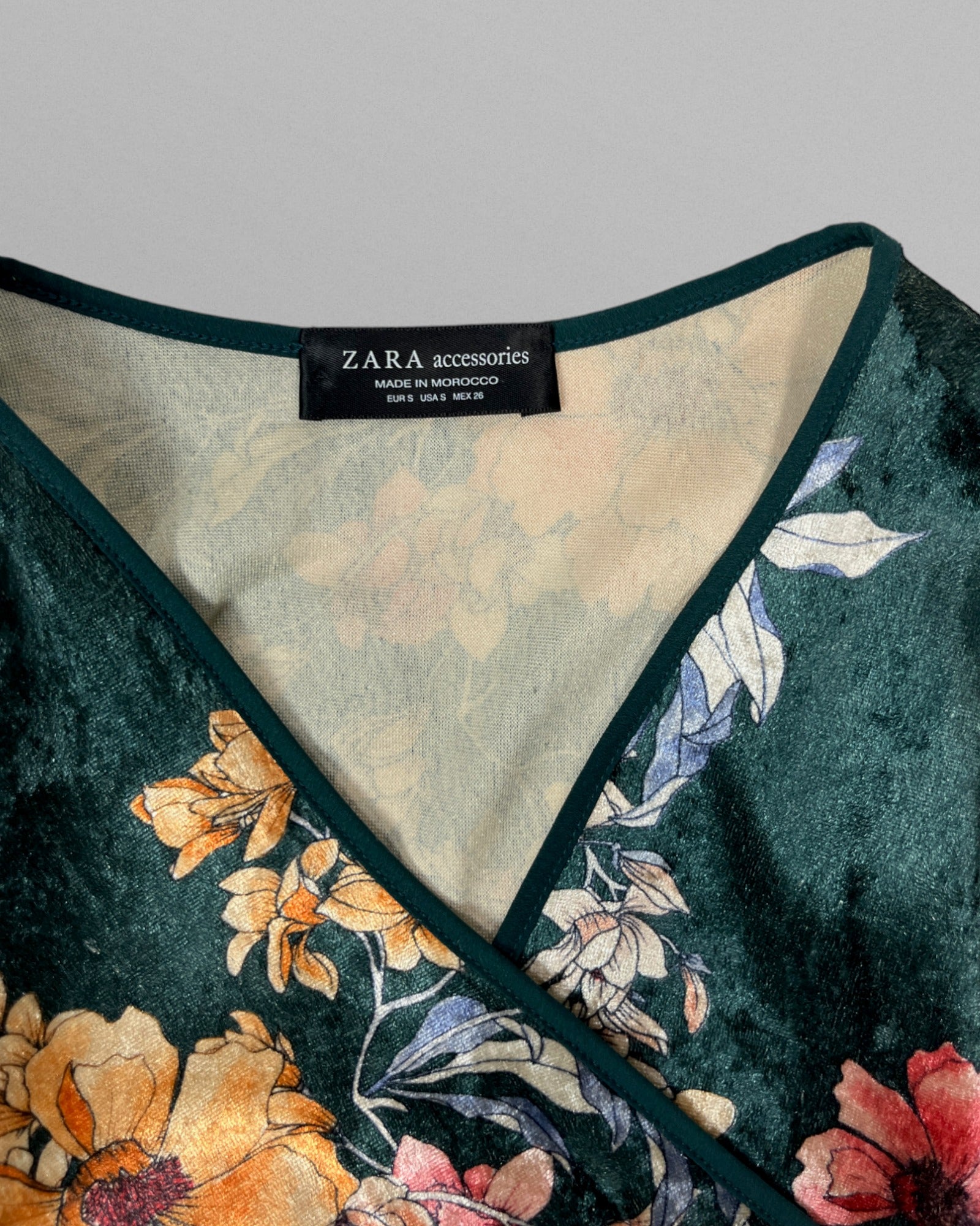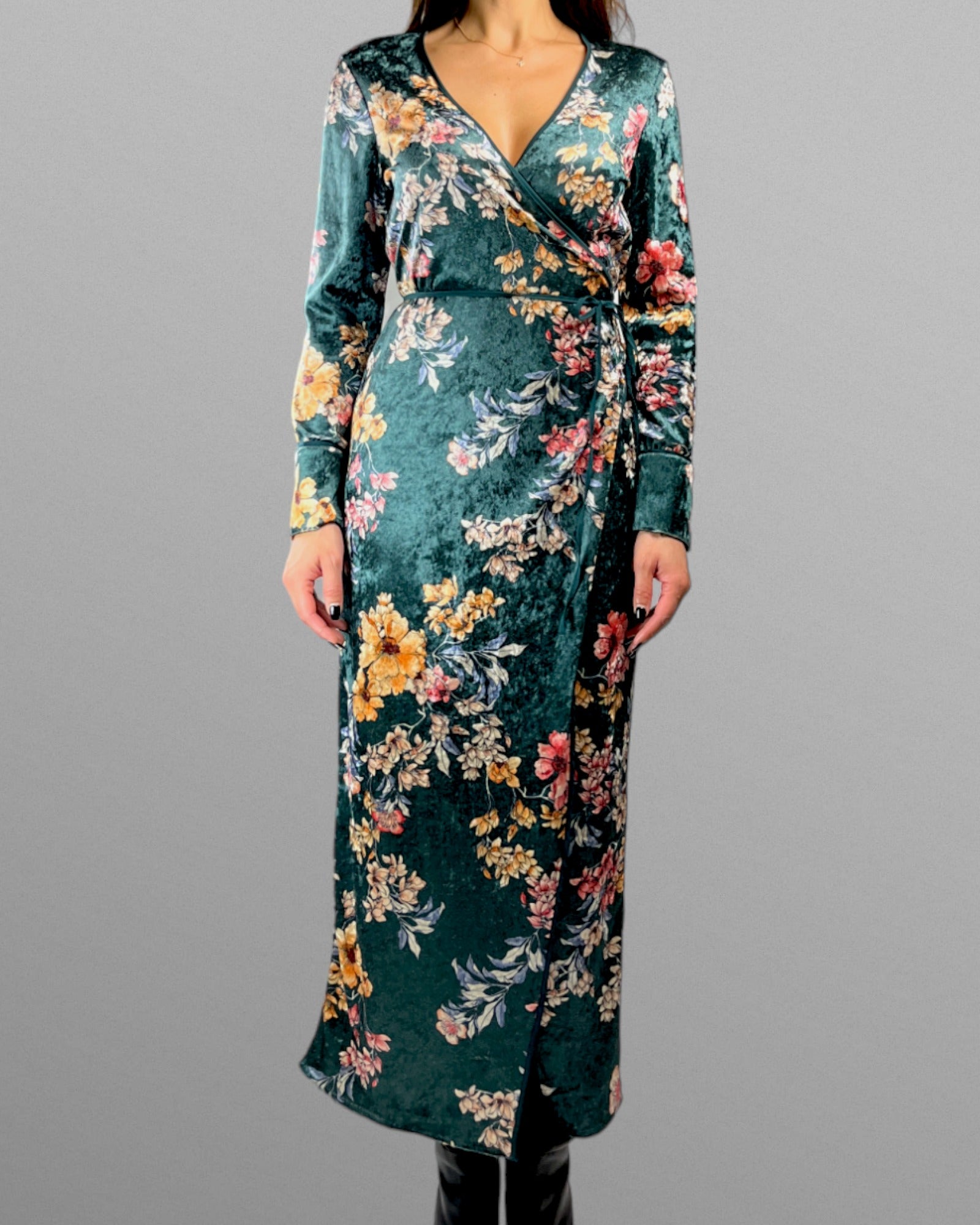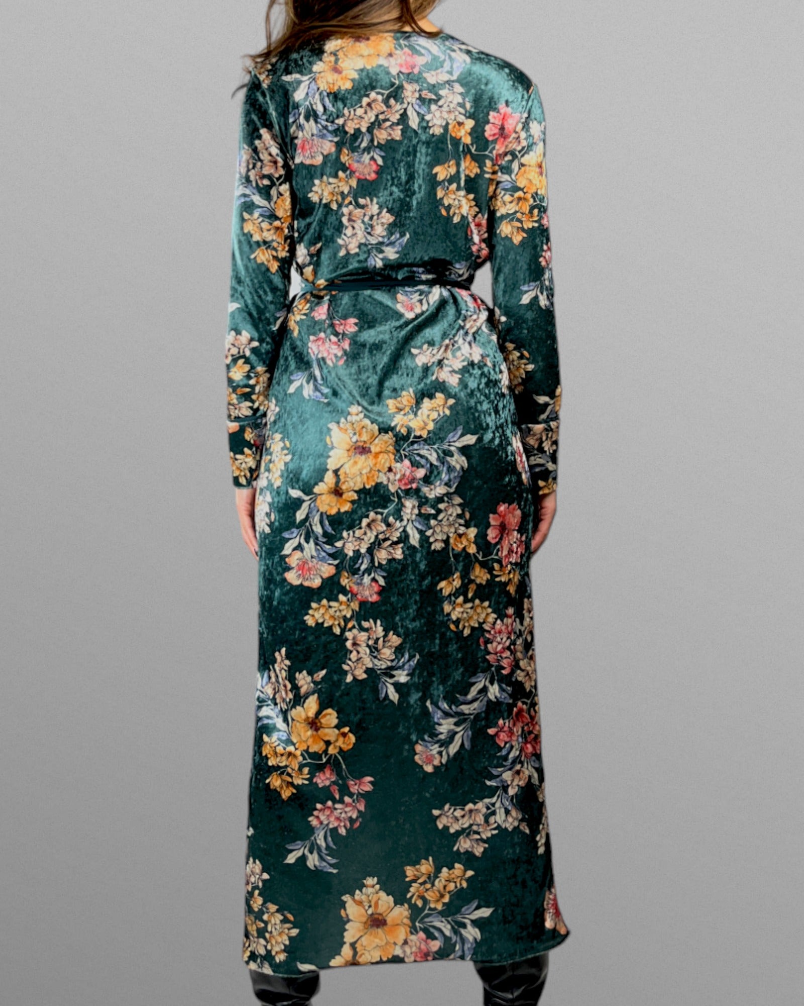 Härlig lång omlottklänning med blommor. Tyget är i stretchig plysch och klänningen är mycket följsam och skön.