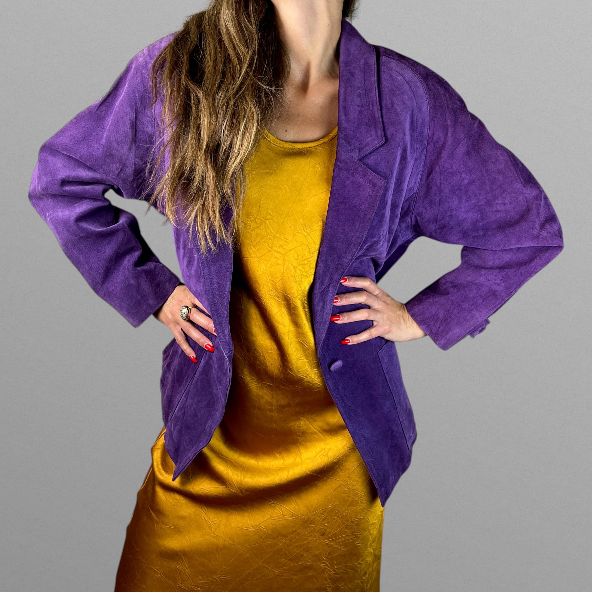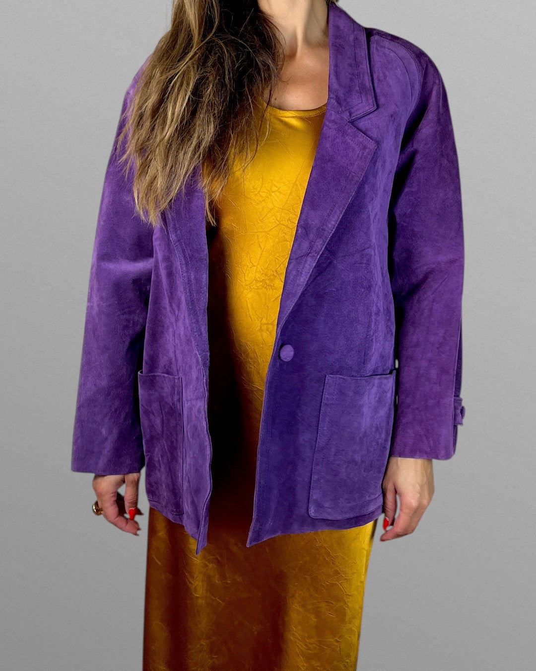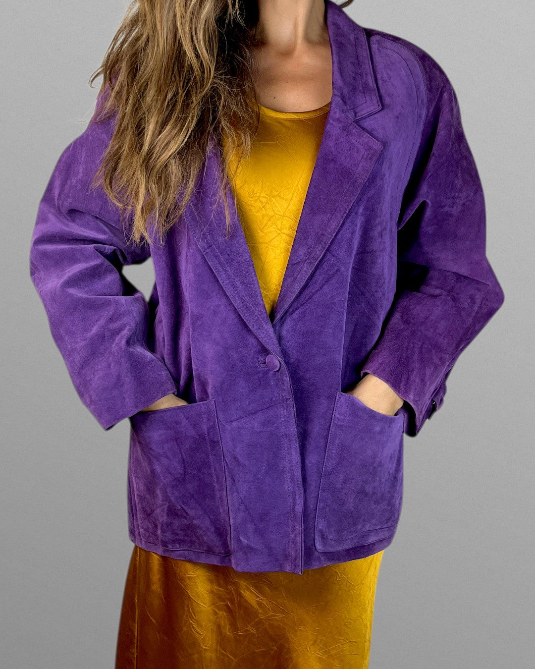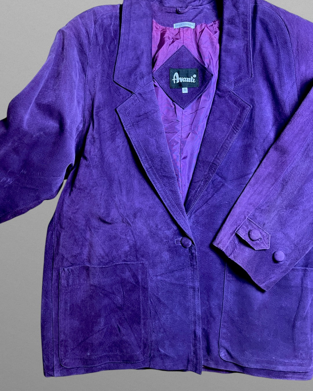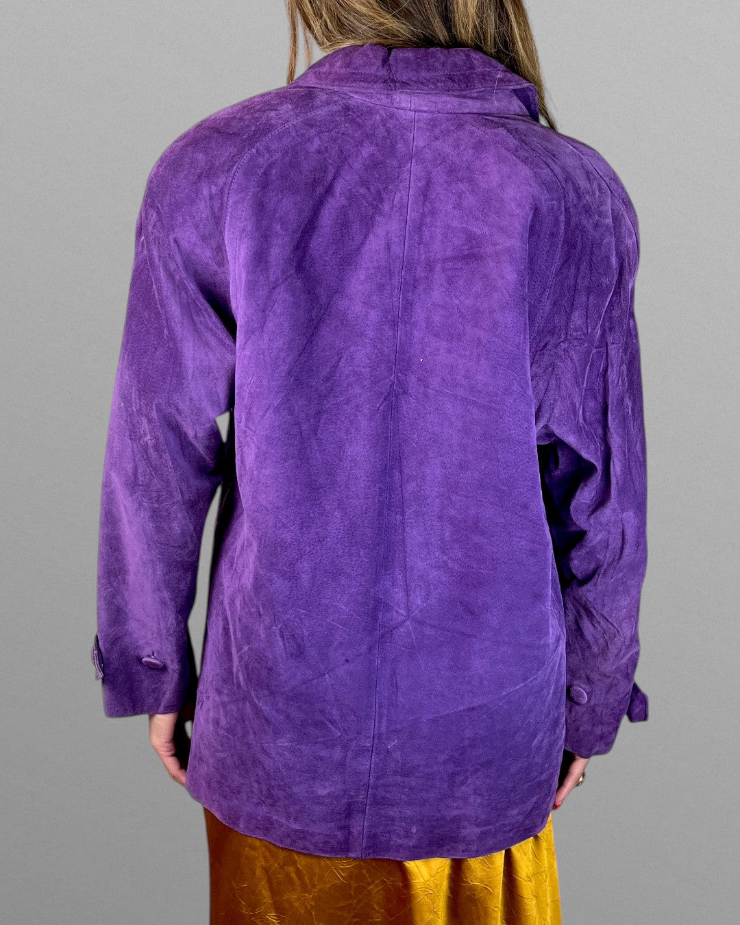 Underbar lila jacka i mocka med klädda knappar och lappfickor. En vintagedröm och dessutom i nyskick.