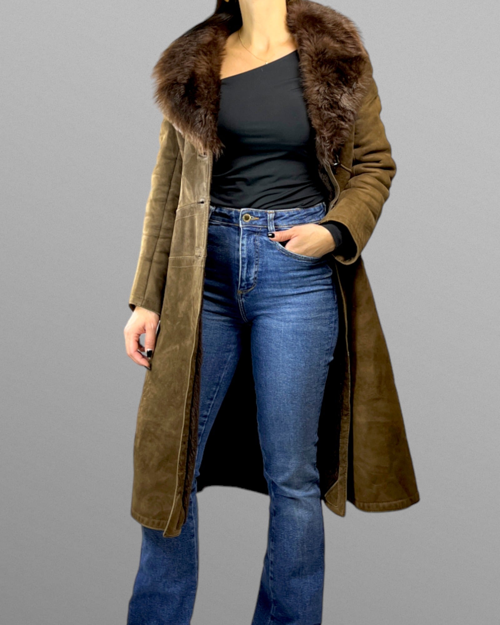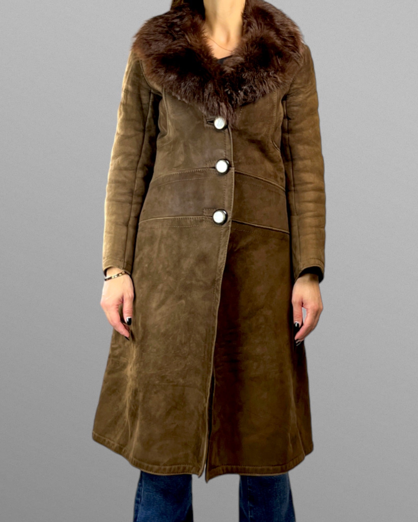 Välbevarad mockakappa med pälskrage från 70-talet. Kappan är varm och skön då hela insidan är av päls. Modellen är klockad och ger en fin silhuett.