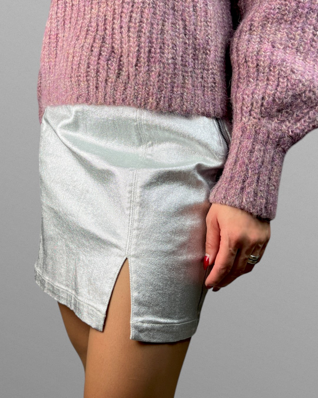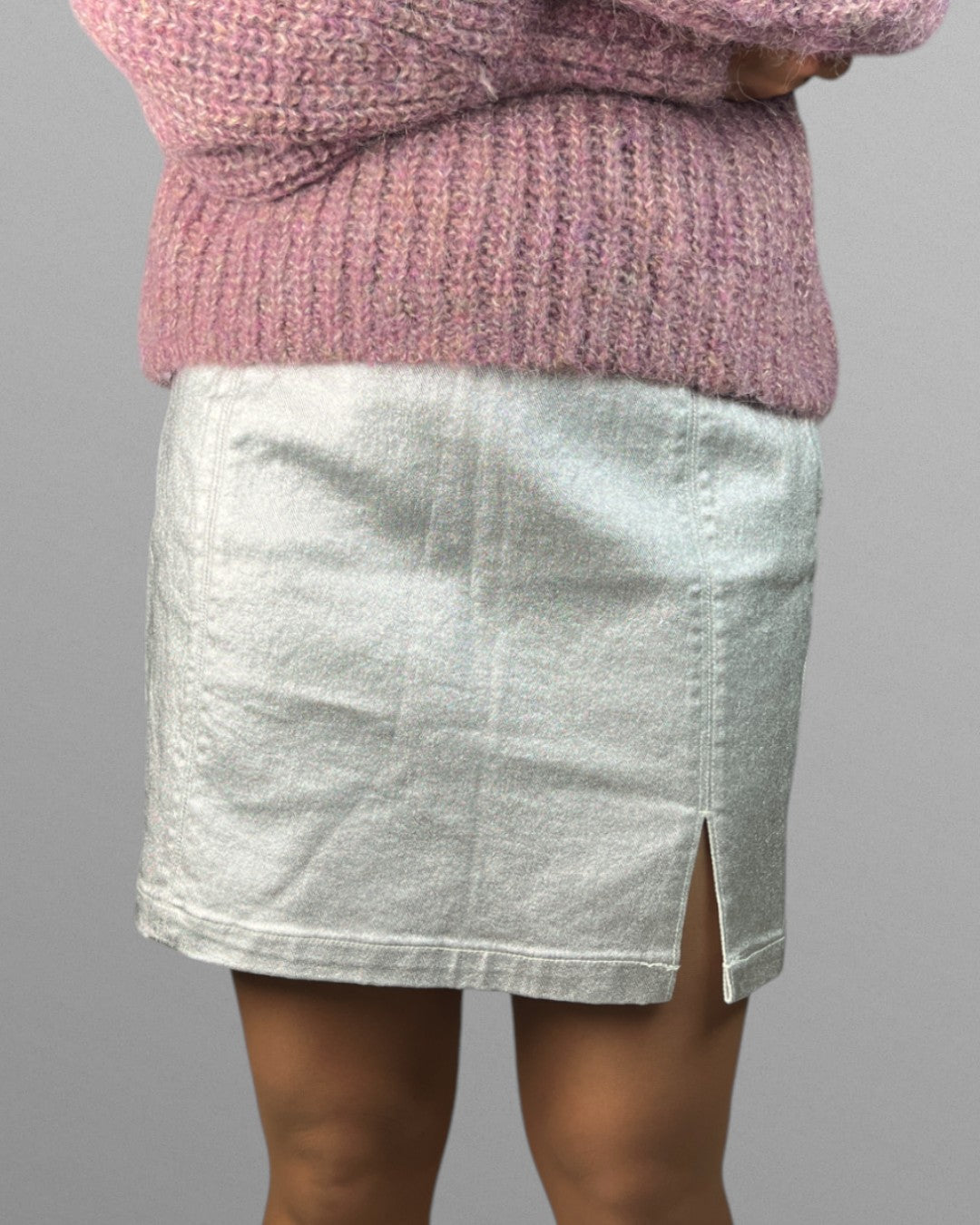Kort silvrig kjol med slits. Stängs smidigt med dragkedja och knapp i sidan.