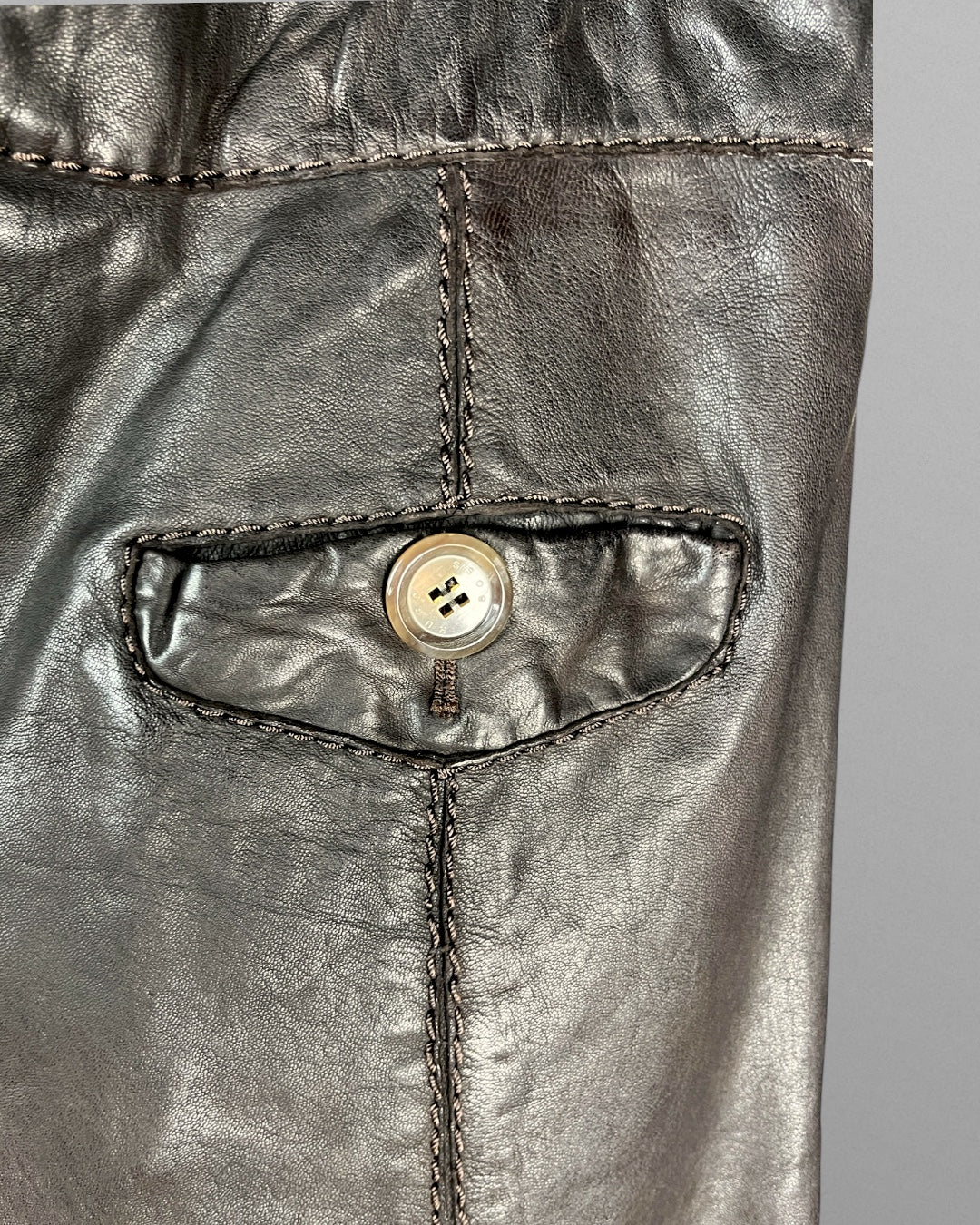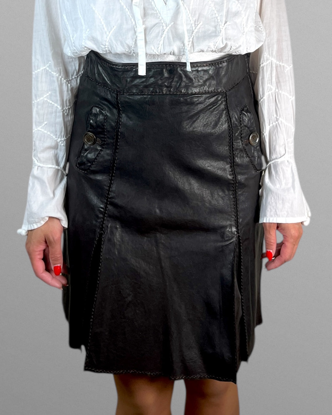 Mörkbrun skinnkjol med snygga detaljer som dekorativa sömmar.