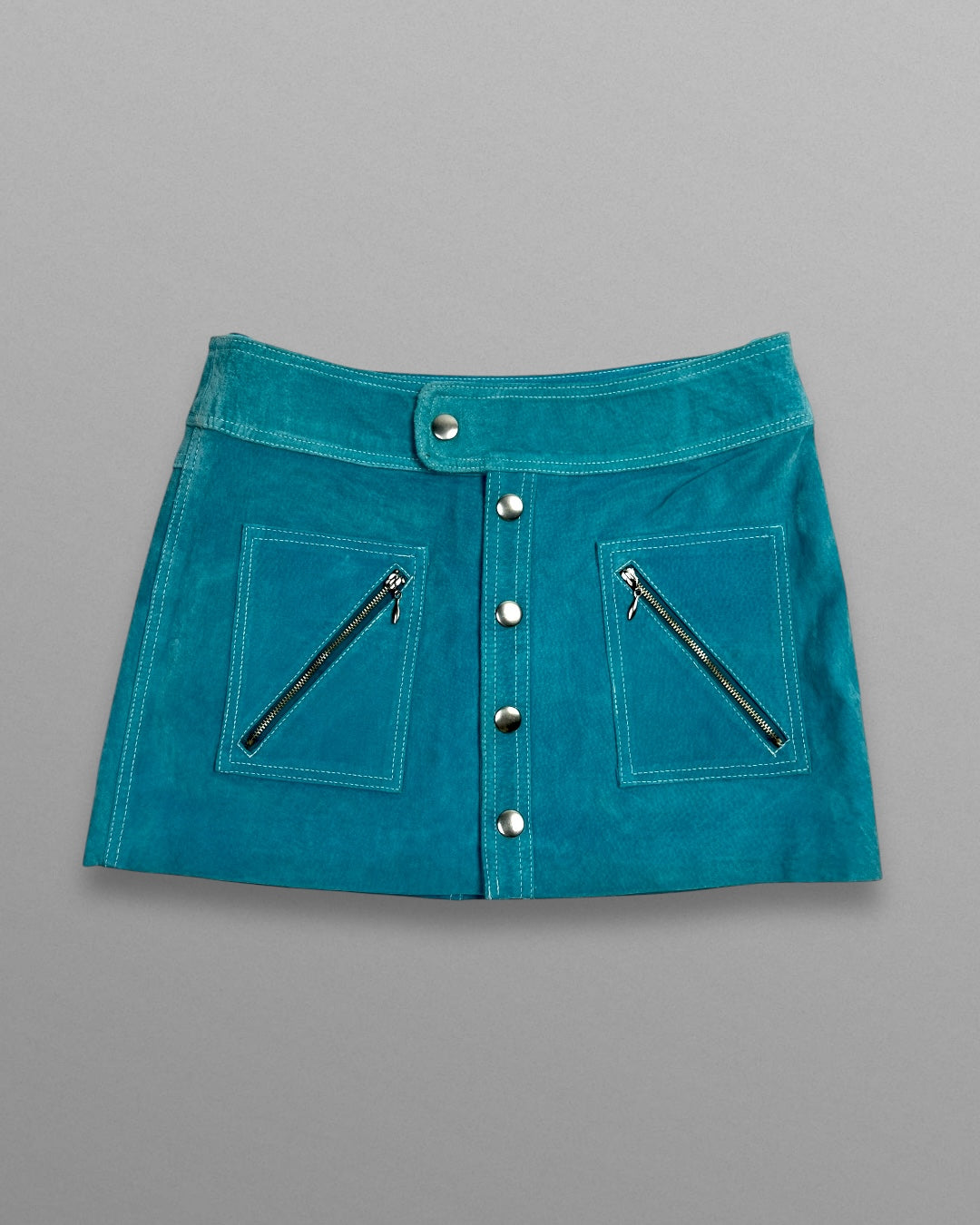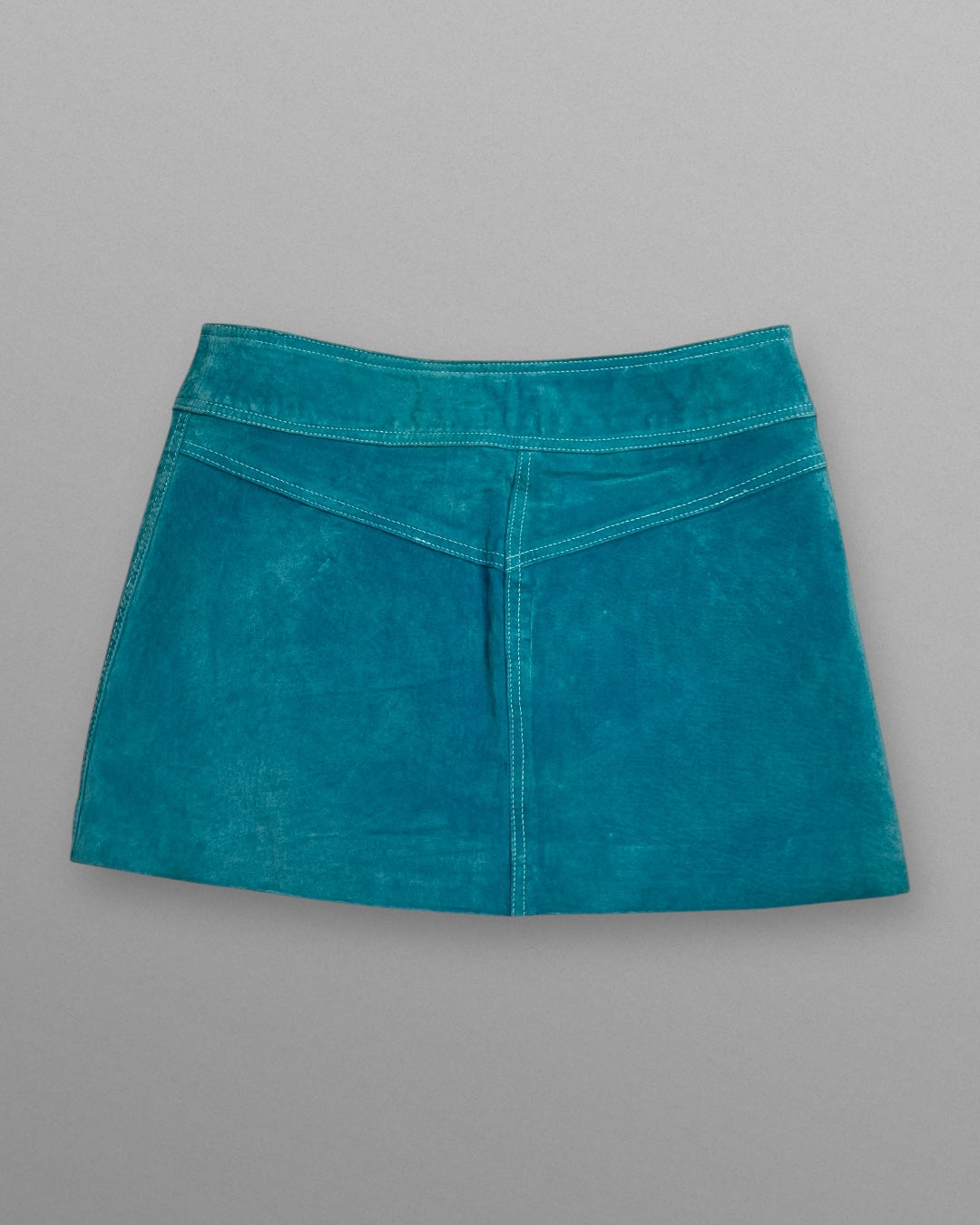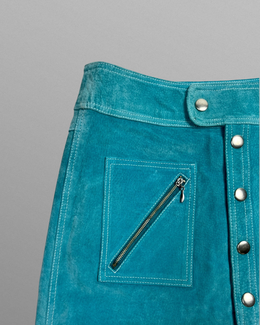 Turkos A-linjeformad kort mockakjol med fina detaljer. Försluts med dragkedja fram.