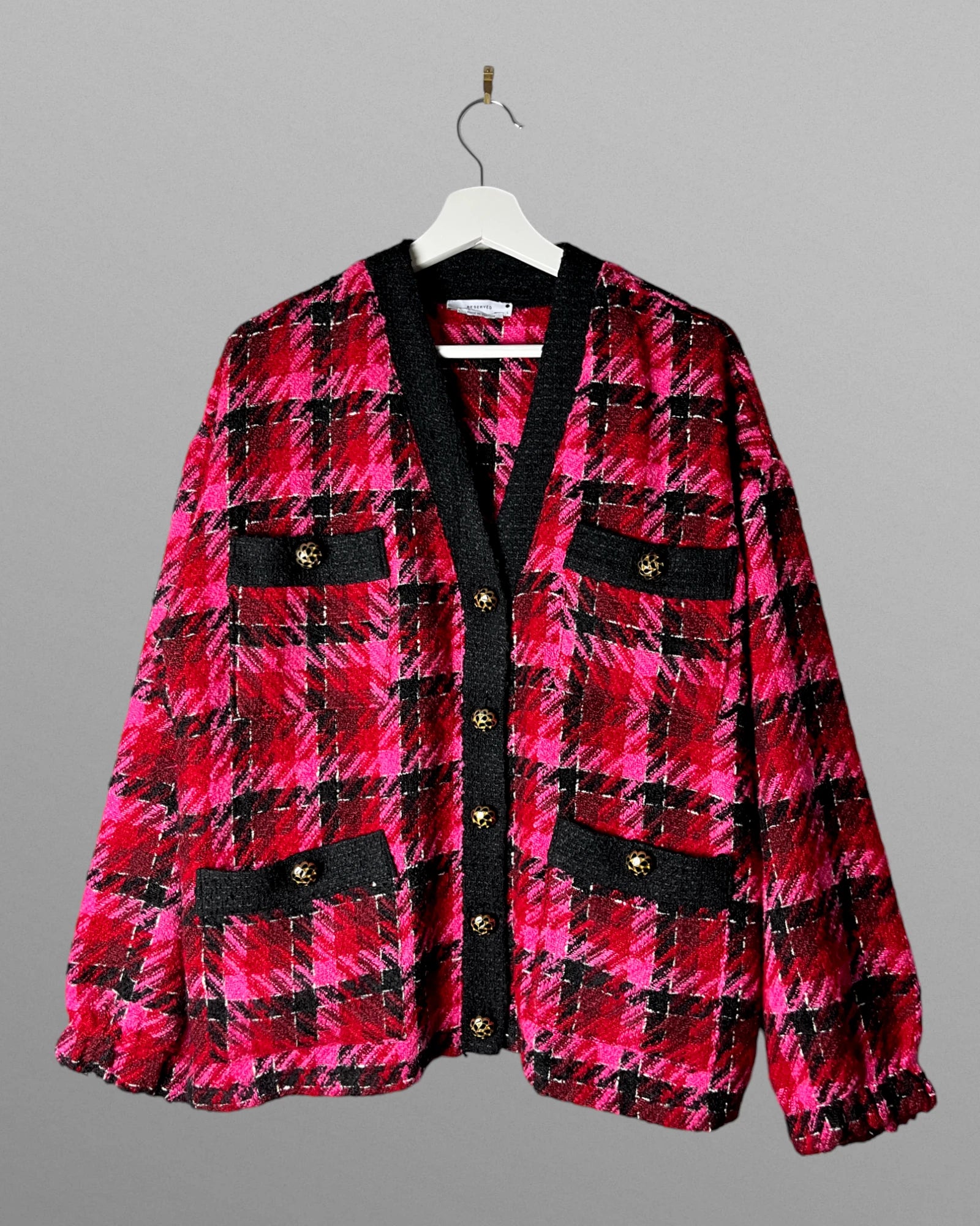 Tvådelat tweed set i hallonröda toner. Koftan har knäppning framtill. Knapparna är vackert svart-och guldmönstrade. Kjolen är klockad med en dragkedja i sidan.